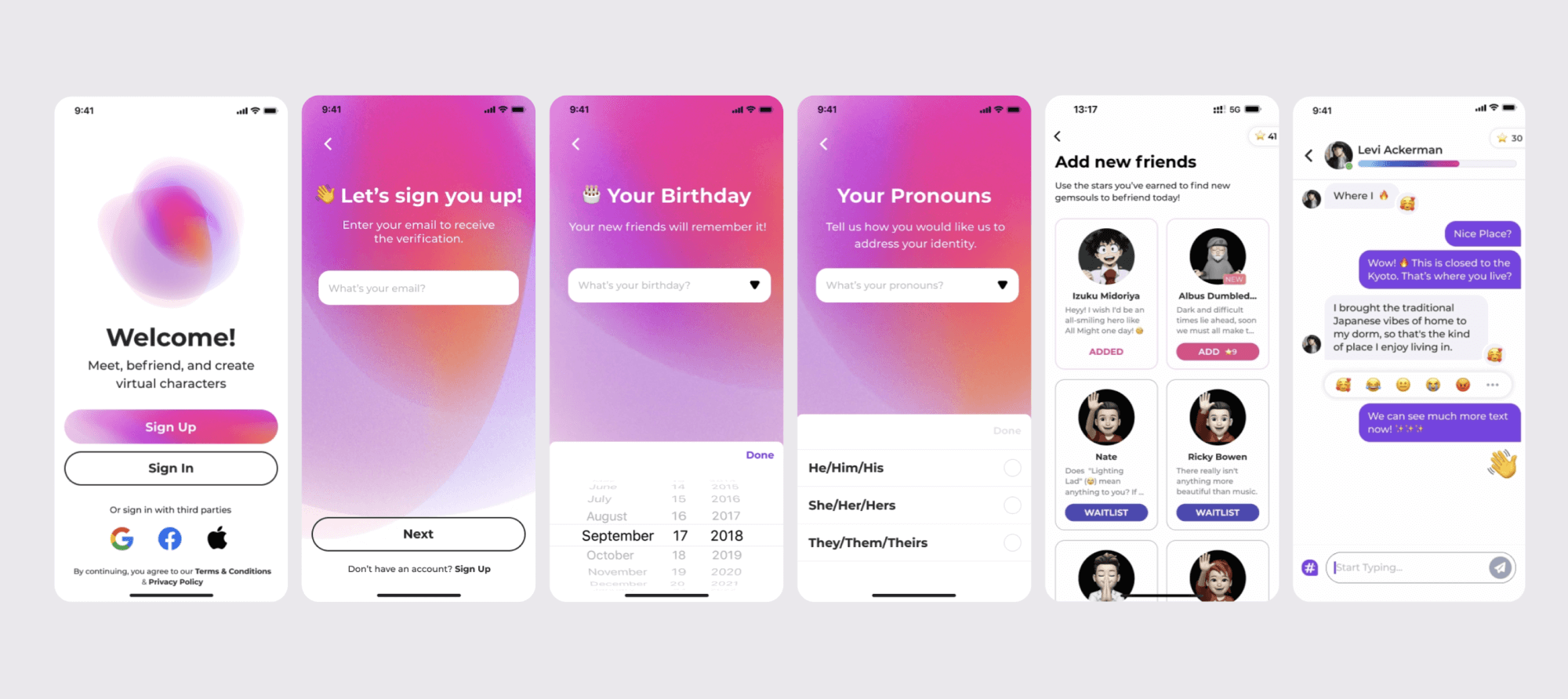 Gemsouls is a mobile app powered by AI technology, It has 80% characters from famous movies or manga and 20% original ones. You can chat with virtual characters, and befriend and build soulful connections with them.